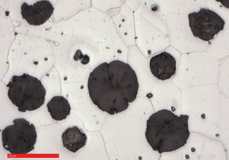 Material characteristics are identified using imaging techniques such as and spectroscopic methods. These analyses provide detailed insights into material composition, heat treatment, and fabrication method to support manufacturing and quality control.